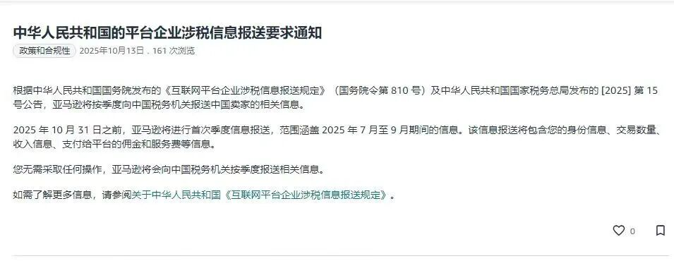 数据报送已成定局,跨境电商粗放生长阶段宣告结束!今天,各大跨境电商卖家群被一则消息引爆:亚马逊正式向卖家发出通知,将向中国税务机关报送卖家身份信息、交易数量、收入信息、支付给平台的佣金和服务费等数据。01 平台新规:亚马逊、沃尔玛加入报送行列亚马逊后台发布的通知显示,平台将按季度向中国税务机关报送