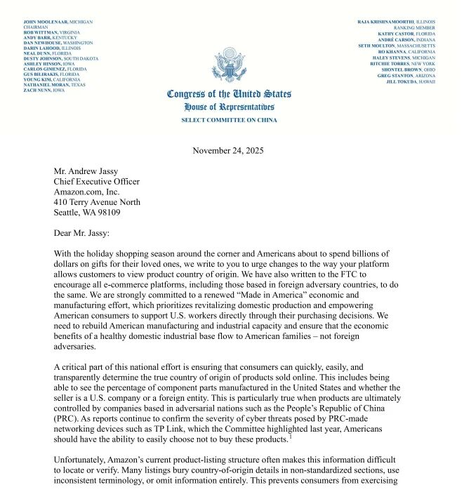 跨境电商合规升级:美国要求平台全面标注商品原产地跨境电商合规大升级!卖家面临紧急 Deadline,违规商品将面临直接下架风险。近日,美国国会众议院美中战略竞争特别委员会对亚马逊发出明确要求,责令近日,美国国会众议院美中战略竞争特别委员会对亚马逊发出明确要求,责令其全面标注所有商品的完整原产国信息,并设下两个